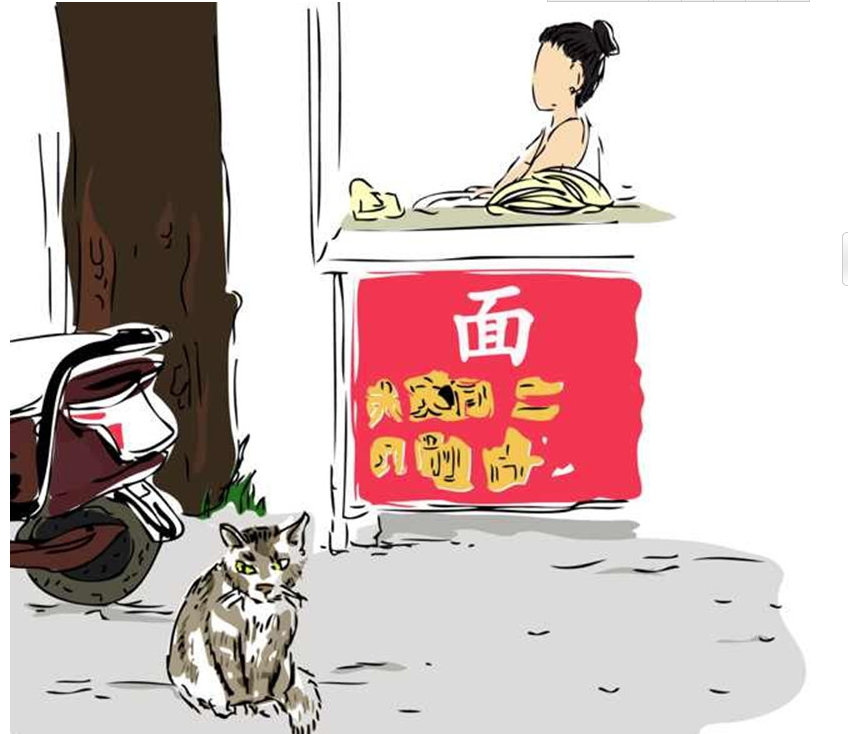 道北村中的一家面食店,店主在制作新鮮的面條,小貓在樹蔭下乘涼