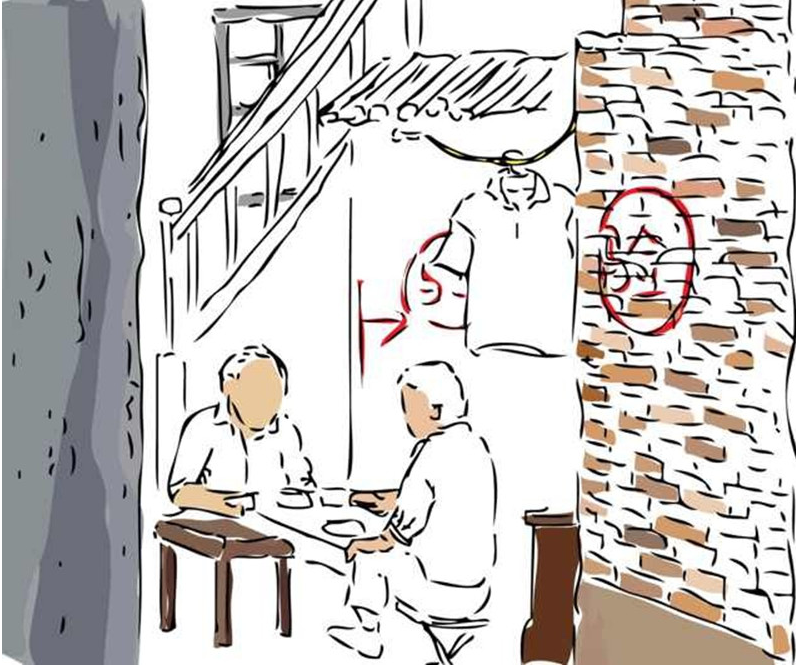 老人們悠閑地在自家院中下著中國象棋,享受美好的下午茶時光